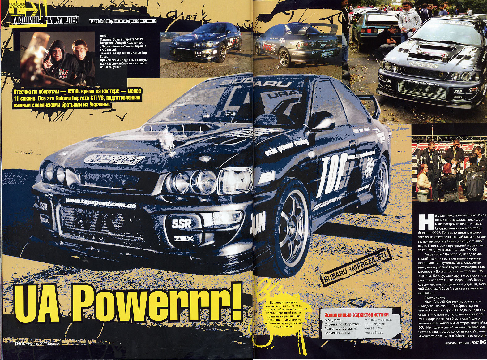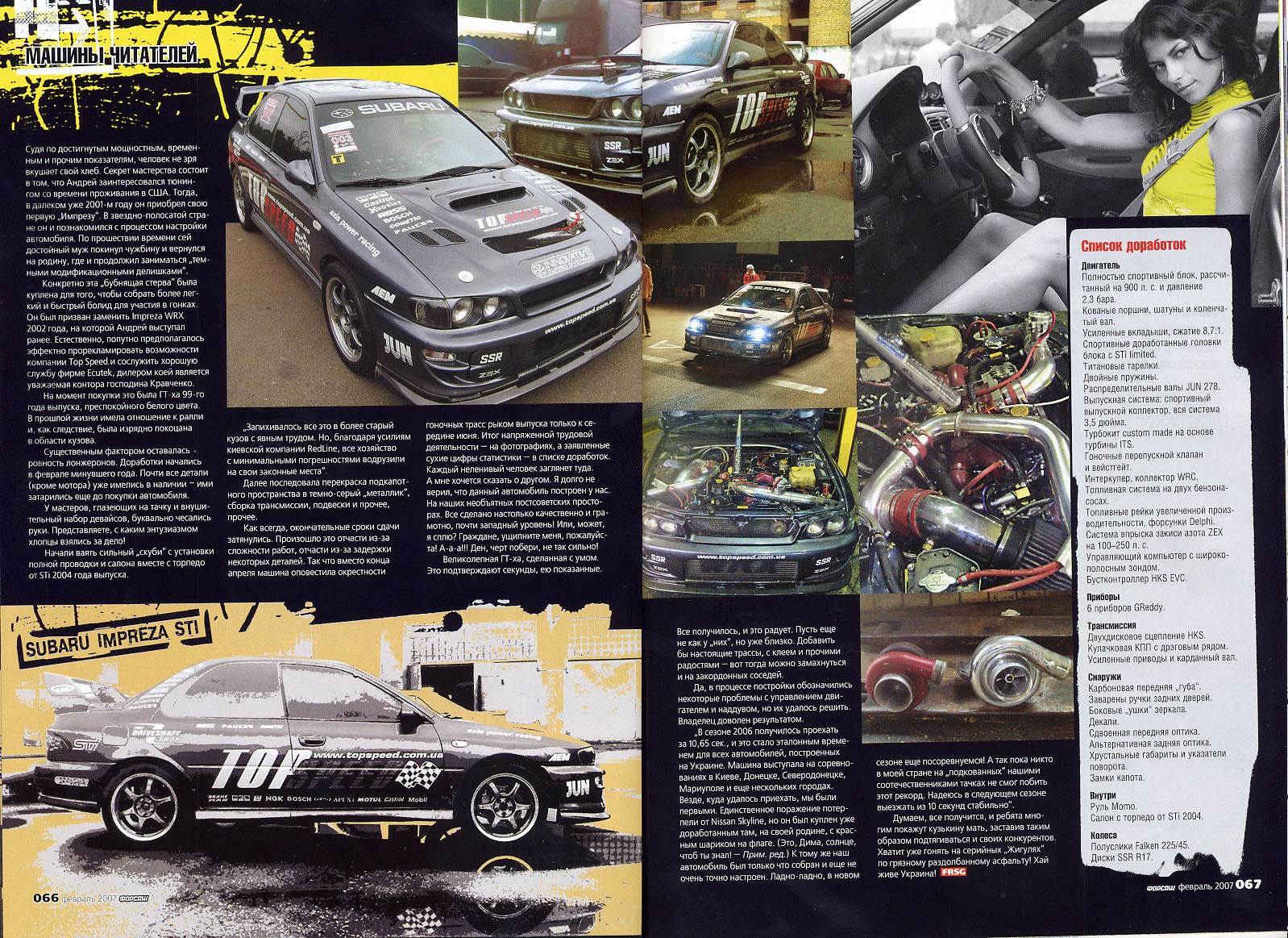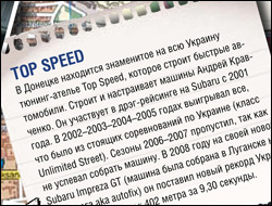 ![]() | Журнал Тюнинг Автомобилей, Москва. 2009 год. Статья в журнале Тюнинг Автомобилей о нашем автомобиле, субару импреза STI v6, и других автомобилях подготовленных в компании Topspeed! В статье описание авто, участие в соревнованиях и пр. информация. смотреть часть 1 смотреть часть 2 |